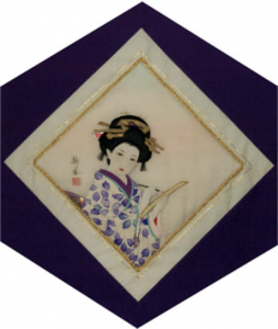 A portrait of a graceful woman, peacefully painting while dressed in a customary kimono, is the theme of the Japan block. This lovely scene, produced entirely in silk, was created by Sayoh Yabu through a three dimensional textile art technique called Oshie (oh-shee-ay). This technique involves folding small pieces of the fabric to produce a 3-dimensional image. The Japanese design aesthetic is asymmetrical yet perfectly balanced, always embodying a sophisticated simplicity that delicately balances colour, form and line. Over her right shoulder, the artist’s name is finely hand painted onto a soft background of billowing white and pale pink clouds. A double strand of gold braiding surrounds the piece which was then edged in fine Japanese gold work.