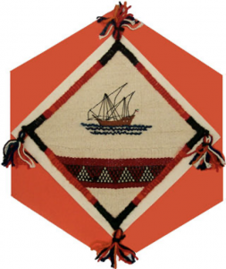 Made from a camel bag donated by His Excellency Majdi Al-Dhafiri of the Embassy of the State of Kuwait, this block showcases the ancient art of Bedouin weaving. The pattern is woven with wool that has been hand-dyed using traditional natural dyes. Called al sadu in Arabic, this art-form records a passing way of life. The designs portray the stark beauty of the desert and reflects the country’s rich heritage. The embroidered wooden ship (dhow), with its distinctive sails, represents Kuwait’s long history of maritime life and the dangerous tradition of pearl diving. Tightly packed blanket stitches in hand-dyed red, black and orange yarn create a solid border around the scene. Typically, camel, sheep and goat wool is used for weaving. Tassels, attached at each corner, reflect an important decorative element in Kuwaiti cultural traditions.