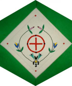 Wendy Whitecloud, a law professor at the University of Manitoba, produced the Dakota block from a design her good friend, Rainey Gaywish, created. Rainey, who also supplied the beads and materials for the piece, based the design on an historic Eastern Dakota (Sioux) pipe-bag pattern from the mid-1800s. It begins with a foundation in black and white beading that shows the duality of life for Dakota people; past and present, male and female. The mandala represents the circle of all life, the four directions of the universe, and the Dakota people’s belief that all animate or inanimate forms are their relatives. The stylized flowers, a traditional pattern that would have been created in quillwork before the availability of beads, are based on typical eastern Prairies flora.