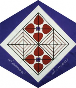 Among Samoa’s oldest cultural traditions is the making of siapo, a tapa-like fabric made exclusively from bark of the paper mulberry tree. The skills to create such cloth, which is used for both functional and ceremonial purposes, have been passed from generation to generation for centuries, but even so, this distinctive art form has become nearly extinct. This block, made by Elizabeth Ferguson, features a modern interpretation of siapo, represented in the customary colours of red, black and brown. The leaf motif, appliquéd against a cotton background, is one of the thirteen traditional design elements, which form the basis of all siapo and reflect the Samoan environment.