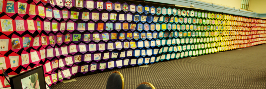 This project can be made with a many materials and can comprise a wide range of ages. The example shown below was made with over 1,000 students from the Upper Canada District School Board, from Kindergarten to Grade 12. The Youth Quilt was over 100 feet long.