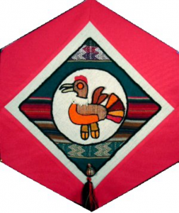 A stylized condor in colourful wools dominates the centre of the Bolivia block, created through the cooperative efforts of Norma Greenhouse and Les Femmes de Bolivie. The Andean Condor, Bolivia’s national bird, represents power, strength, grandeur, freedom and health. Natural dyes were used to colour the Bayeta de la tierra fabric, which was hand-woven from 100 percent lamb’s wool. The pattern is a traditional design associated with Tiawanacu, the capital of the Aymara civilization.